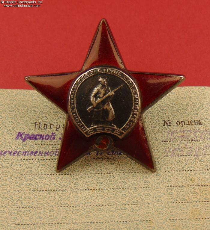 Order of the Red Star, Type 6, Var. 3, Sub-var. 1, #580790, awarded on 9 May 1944 to a company commander for leading an infantry assault and defending his hard-won position during the offensive that lifted the siege of Leningrad. During the previous month, he was also awarded with an Order of the Red Banner for another exceptionally bold assault that resulted in the capture of 8 concrete pillboxes, a large number of weapons, and 30 POWs. The order is a nice early piece in excellent condition. Comes with archival research.
